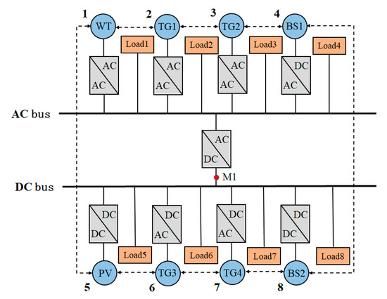 In this paper, we mainly focus on the isolated AC/DC hybrid microgrid. Figure 1 presents the structure information of the considered model in this paper, which mainly contains an AC sub-grid, a DC sub-grid, and a power conversion unit that is in-lined between sub-grids. The wind turbine (WT) is connected to the micro-grid AC bus, and the solar photovoltaic unit (PV) is connected to the micro-grid DC bus, while the energy storage unit (BS) and the AC/DC load unit (Load) are in both parts. The AC sub-grids and DC sub-grids are connected by an AC/DC bidirectional converter (IC) between the AC bus and the DC bus, and M1 is an AC/DC tie line power monitoring point. The dashed lines in Figure 1 indicate the communication links between the various units.