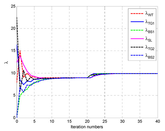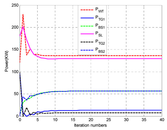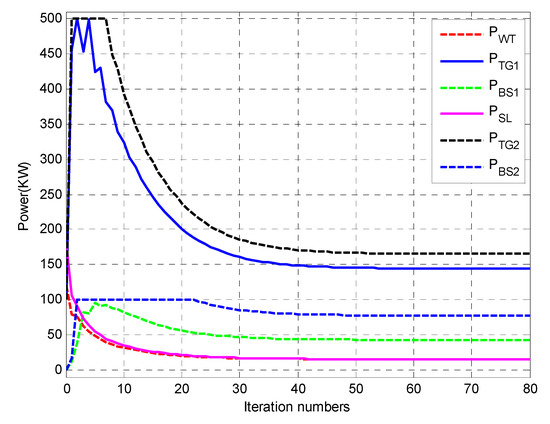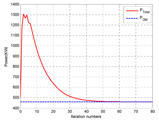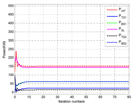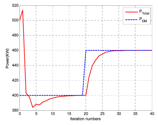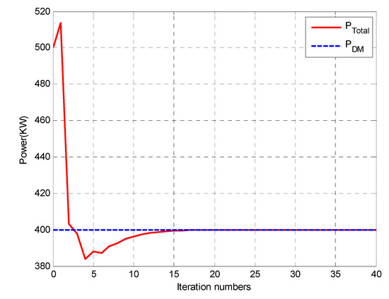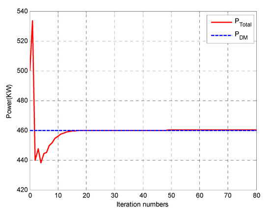 In this section, the proposed consensus algorithm will be compared with Reference [42]. Without loss of generality, the parameter values of a and b use the ones in Reference [42] and we chose the time period 12:00–13:00 as an example. From Table 1, we can see that in this period, the load demand is 460 kW. By using the proposed method, the simulation results are shown in Figure 13 and Figure 14.