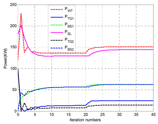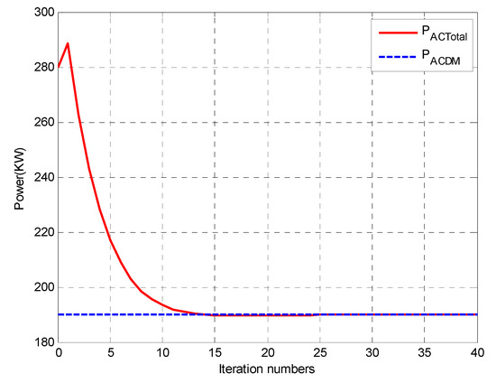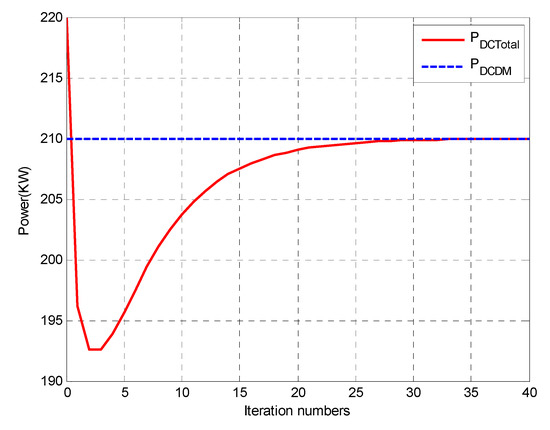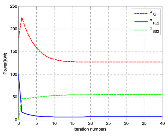 Similarly, three parts of distributed power supply, for instance, photovoltaic power generation, traditional generator, and energy storage unit, are in the DC sub-grid. In the single-period simulation process, the load of the DC sub-grid is taken as 190 kW, and the simulation by using the proposed two-layer consensus algorithm is presented in Figure 7 and Figure 8. Figure 7 is the power output of the DC side node of a single period in the DC sub-grid, which finally converges to 127.70, 6.70, and 55.60 kW respectively, and the sum is 190 kW. Figure 8 is a power mismatch of a single period in the DC sub-grid.