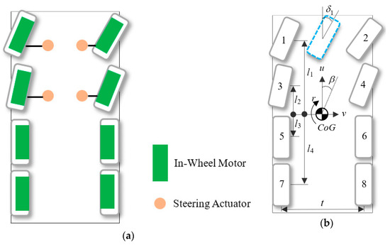 Figure 1 gives the model of the IWMD and wheel-individual steer vehicle. As shown in Figure 1a, the vehicle is driven by eight in-wheel motors, and each wheel can be steered independently by the steering actuator. Figure 1b gives the parameters of the vehicle model.