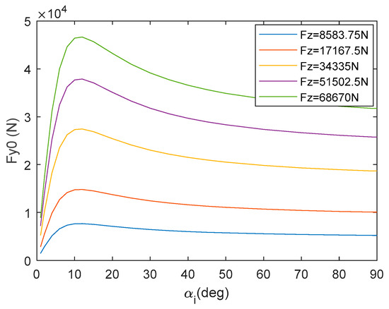 Considering that the failed wheel often works at a large tire slip angle, the traditional tire model formula assumption is no longer applicable, therefore, the tire model with known parameters is adopted. The tire slip angle is calculated through Equation (16). The maximum lateral tire force for a given tire slip angle when the longitudinal tire force is zero can be obtained through the lateral tire force map (see Figure 2), which is related to tire slip angle and vertical tire force.