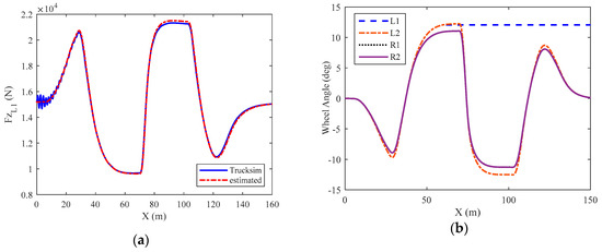 Figure 5a shows the vertical tire force of left front wheel (No.1), which demonstrates the good coincidence between the estimated vertical tire force and the Trucksim value. Figure 5b shows the wheel angle curves, which indicates that the front left wheel (L1) angle stays at an angle of 12 degrees after steering failure and other wheels operate well.