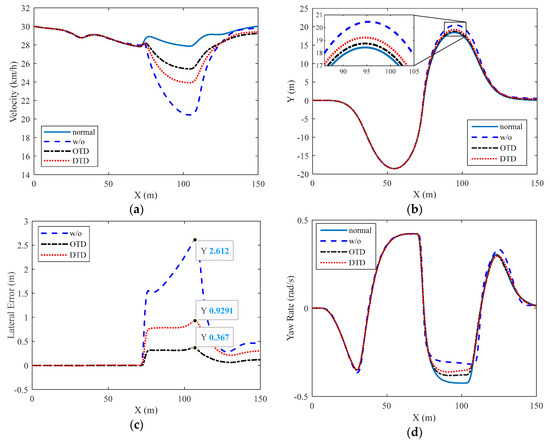 As shown in Figure 6c,d, comparing with the normal vehicle, the peak value of the lateral displacement error reaches 2.612 m, 0.929 m, and 0.367 m for vehicle without control (w/o), under DTD control, and under OTD control, respectively. In other words, the LDER of the OTD controlled vehicle is 86% and 60.5% compared with the vehicle without control (w/o) and under DTD control, respectively. The yaw rate curves in Figure 6d demonstrate that the vehicle under OTD control follows the normal vehicle best before and after corning.