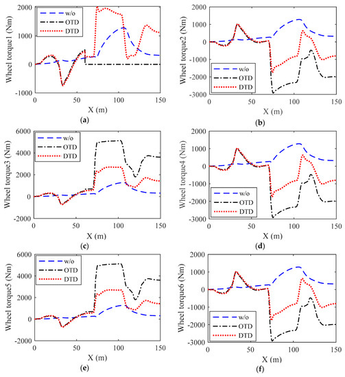 Different from the vehicle under DTD control, the torque on the failed wheel 1 is zero for OTD controlled vehicle when failure occurs, and thus avoids energy consumption and reduces the disturbance of the driving force on this wheel. Due to the absence of the driving force on the failed wheel and to form the required yaw moment for trajectory correction, drive torques of the normal wheels on the failure side (left side) are significantly larger than that of the normal side (right side).