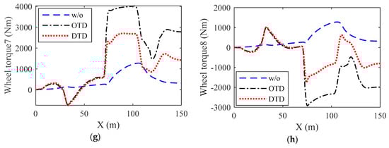 Figure 7 shows the wheel torque for different control methods. The wheels numbered 1, 3, 5, and 7 are on the left side (see Figure 4) of the vehicle, and the wheels numbered 2, 4, 6, and 8 are on the right side. It can be observed that the eight in-wheel motor torques are equal for EVs without fail-operation control. As for the vehicle under DTD control, the eight in-wheel motor torques on both sides are different because of the requirement to form the additional yaw moment to correct the vehicle.