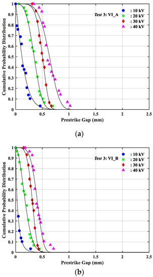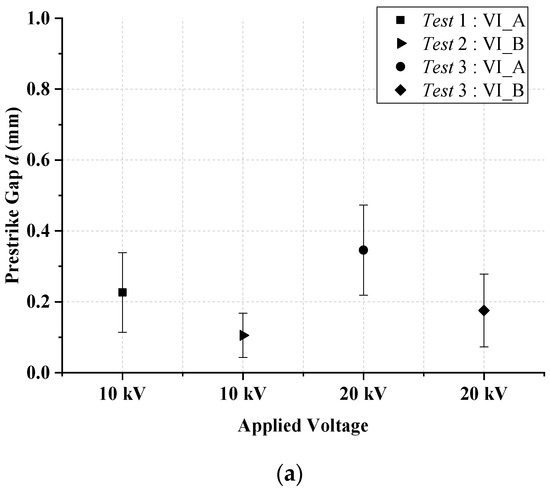 where N is the number of each experimental data set; is the average value of each set of the experimental data, and is the prestrike gap measured during the ith making operation. The scatters in the prestrike gaps in all the test groups under varied applied voltages are given in Table 3. In the last column, σ indicates the scatter, where a lager value of σ indicates more scatter in the experimental data of the prestrike gaps.