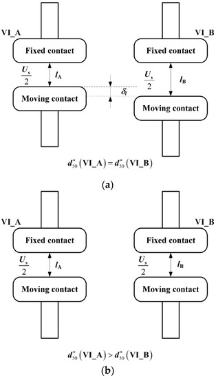 Similar effects can also be found in the case when the voltage-sharing ratios of VI_A and VI_B are not equal to each other. As shown in Figure 11c, both VI_A and VI_B are synchronized perfectly and have the same inherent 50% prestrike gap, since VI_A on the high voltage side shares voltage higher than Us/2. The interrupter VI_A is highly possible to breakdown when the vacuum gap length is larger than the inherent 50% prestrike gap, i.e., lA > . Noting VI_A and VI_B are perfectly synchronized (lA = lB), the measured 50% prestrike gap of VI_B would be larger than its inherent one.