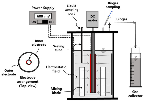 A bioelectrochemical nitrogen removal reactor (BENR, 3 sets, cylindrical type, effective volume of 0.5 L, diameter of 8.5 cm, and height of 10 cm) was prepared using acrylic resin as described in a previous study [22] (Figure 1). In brief, the top of the reactor was flanged with a cover plate for sealing. A DC (direct current) motor was mounted on the cover plate and a mixing blade connected to a metal shaft, placed inside the reactor. Moreover, on the cover plate, a gas sampling port, a liquid sampling port, and an off-gas valve were placed. The gas and the liquid sampling ports were covered with n-butyl rubber stoppers. Acrylic sealing tubes were attached to the holes in the bottom of the cover plate for the liquid sampling port and metal shaft hole, that extended into the liquid phase. Two copper foils (0.3 T, copper 99.9%, KDI Co.) of large (26 cm × 9 cm) and small size (5.5 cm × 7 cm) were prepared and surfaces of the foils were coated with a dielectric polymer (Alkydenamel, VOC 470 g/L, Noroo Paint & Coatings co., Ltd., Anyang, Gyeonggi, Busan, Korea) to obtain surface-insulated electrodes. Electrodes were bent in annular shapes and placed on the inner wall of the BENR reactor and the outer wall of the metal shaft, respectively. The spatial distance between the two electrodes was about 3 cm. These electrodes were bounded to terminals of the external DC voltage source (ODA Technologies, Co., Incheon, Korea) with titanium wires.