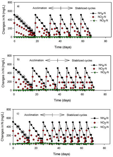 The initial VSS in BENRs was as high as 4500 mg/L, but it decreased exponentially with the operating time (Figure 4b). BENRs were anaerobic reactors exposed to electrostatic fields, and the only carbon source for microbial growth in the bulk solution was bicarbonate, the main alkalinity component at a neutral pH range. It seems that aerobic heterotrophs initially inoculated might have been decayed over time due to the depletion of the oxygen and organic carbon source, while anaerobic autotrophs, including AOE and DNE, were selectively enriched [17,18,22]. The steady value of VSS in BENR20 was 920 mg/L, higher than 860 mg/L in BENR33 or 890 mg/L in BENR67. In BENRs, the alkalinity required for the ammonium oxidation (mg as CaCO3/mg NH4-N) ranged from 1.11 to 1.42, which was significantly higher than 0.24–0.47 in the Anammox process [4,5]. The dependence of alkalinity requirement on the strength of the electrostatic field was not clearly explained, but it was in agreement with the order of the final VSS concentration. It seems that the alkalinity is mainly used for the carbon source for microbial growth, although the bicarbonate can be partially converted to carbon dioxide. This suggests that the high alkalinity requirement for the ammonium oxidation under the electrostatic field would be beneficial for the stable operation of BENRs for nitrogen removal.