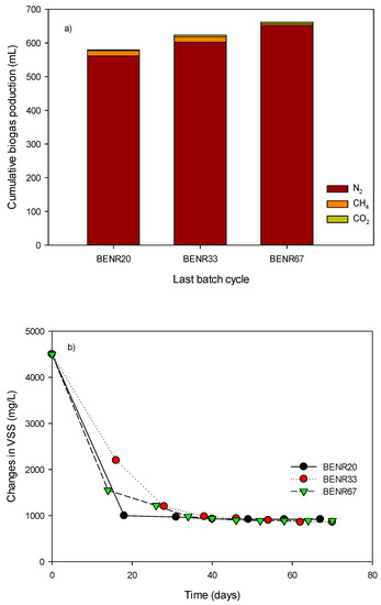 Biogas production and volatile suspended solids in bioelectrochemical nitrogen removal reactors (a) Cumulative biogas production during the last batch cycle, and (b) changes in volatile suspended solids (VSS) over time.