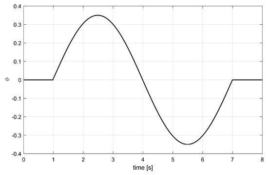 The G-ILC and NO-ILC algorithms are applied to the test system. Simulations are also performed. The simulations and experiments were conducted on a Laptop (i7) ThinkPad P1 Mobile WorkStation with 16 GB RAM/2.20 GHz via MATLAB R2018b. The reference trajectory is shown in Figure 4. The trajectory consists of a single period sin wave and is non-smooth; hence is a challenging task for the ILC algorithm. Sixteen iteration trials were performed for each algorithm. The input update for the G-ILC and NO-ILC algorithms was acquired by Equations (28) and (35), respectively, with the help of the linearized quadrotor dynamics from Equation (49).
