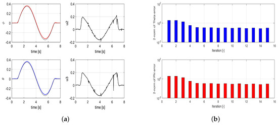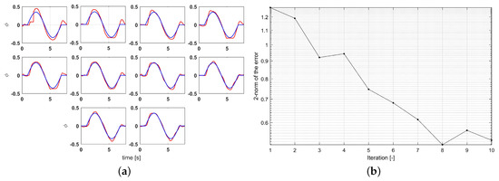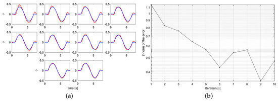 The performance of the NO-ILC algorithm is also investigated with the reference signal shown in Figure 4. The results are shown in Figure 8a. The weighting parameter is set to . The value of Q can be increased to improve convergence, but Figure 8b shows the convergence is similar to that of the G-ILC experiment, with the latter slightly better. Convergence was achieved after 8 iterations.