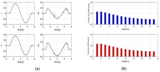 Demonstrating the monotonic convergence of the G-ILC algorithm is also important. The simulation results show a notable decrease in the error over different trial iterations. Figure 5 shows the decrease of the 2-norm of the error, with a value of 0.3092 at the 16th iteration. The variation in and over time for different iterations are also shown in Figure 5.