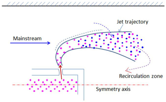 A circular transverse jet is usually issued at a certain angle to the main flow direction, from a circular gap of a tube, located at the center of the mainstream. Under the impact of the mainstream, the circular jet bends to the direction of mainstream and mixes with the mainstream to form a fan-shaped flow trajectory, as shown in Figure 1. The fan-shaped flow trajectory is like an umbrella to become an aerodynamic barrier in the flow field, behind which a negative pressure zone is formed. Due to the negative pressure zone, the surrounding fluid generates backflow and forms a recirculation zone. The presence of the recirculation zone makes it possible to stabilize the flame. Russian researchers Kosterin et al. [17,18] have studied the jet trajectory and mixing characteristics of circular transverse jets, ejected through a convergent circular gap. Other public literature on circular transverse are very limited, especially researches by numerical calculation have not been found yet.