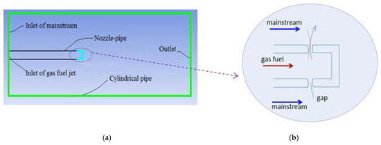 Schematic of the calculation model. (a) The whole schematic of the calculation model; (b) Enlarged view of the nozzle pipe jet.