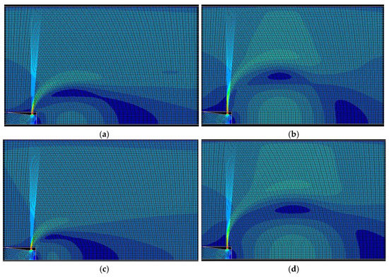 Velocity contours calculated under different turbulence models. (a) k-ε standard; (b) k-ε Realizable; (c) SST k-ω; (d) RSM—linear pressure–strain.