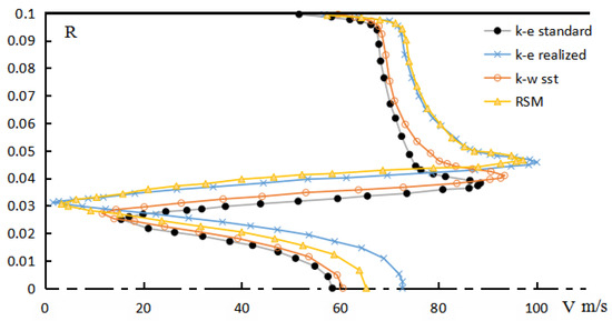It can be seen from Figure 5 that the velocity profiles calculated by the four turbulence models are different: the points with maximum velocity obtained by the k-ε Realizable and RSM models are farthest from the central symmetric axis, while the points with maximum velocity obtained by the k-ε standard are closest to the central symmetric axis; the backflow velocity calculated by the k-ε standard model on the central symmetric axis is the smallest, and the result calculated by the k-ε Realizable model is the largest.