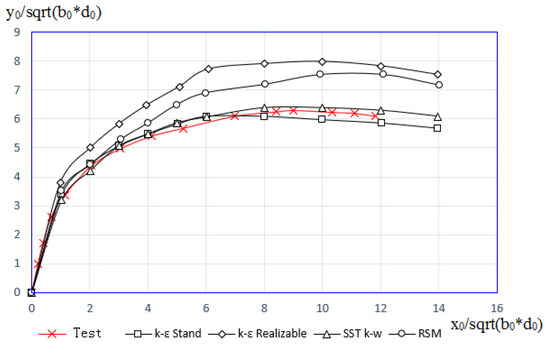 In order to accurately and quantitatively compare with the test results, it is necessary to obtain the jet trajectory, which is a curved surface formed by the maximum velocity point on each cross-section after the interaction of the jet with the mainstream. In the numerical simulation, selecting several sections and getting the coordinates of the maximum velocity points on each section, the connection of the coordinates of the maximum velocity points constitutes the jet trajectory. In order to make the calculation results dimensionless, the coordinates of each point are transformed into x/(b0d0)0.5 and y/(b0d0)0.5 coordinate systems (b0—the gap width, d0—the nozzle pipe diameter), and the jet trajectory in this coordinate system is obtained. The jet trajectory under each turbulence model and test data [18] are shown in Figure 6.