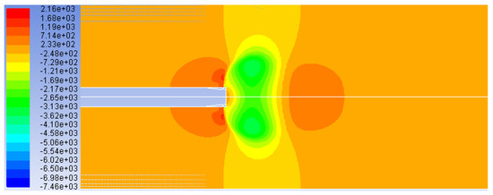 The static pressure distribution in the flow field is shown in Figure 8. It can be seen from Figure 8 that there is an axial symmetric negative pressure area behind the jet trajectory, and the lowest negative pressure value relative to the crossflow, in this case, is −7460 Pa.