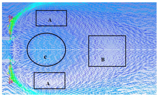 The velocity vector diagram of the flow field is shown in Figure 9. It can be seen from Figure 9 that an obvious recirculation zone is formed behind the jet trajectory, and the recirculation zone is composed of a pair of the axial symmetric vortex on the two-dimensional projection. The pair of the axial symmetric vortex is a vortex ring in the three-dimensional actual structure. According to the velocity vector diagram in Figure 9, the flow mechanism under the interaction of the jet with crossflow can be analyzed as follows: under the barrier effect of the high-speed jet, an axial symmetric negative pressure zone is formed behind the jet. Because of the pressure gradient, the surrounding fluid is sucked into the negative pressure zone, and forms a reverse flow axial velocity of which is opposite to the crossflow. The reverse flow flows until contact and mixes with the newly ejected jet flows downstream. Zone A in Figure 9 represents the center area of the vortex, which corresponds to the circular low-velocity zone in Figure 8, and Zone B borders the reverse flow and the forward flow, and corresponds to the tail low-velocity zone in Figure 7. Region C is the region with the fastest reverse flow velocity after the reverse flow is accelerated by the negative pressure zone, and then the reverse flow velocity decreases due to the blocking effect of the jet.