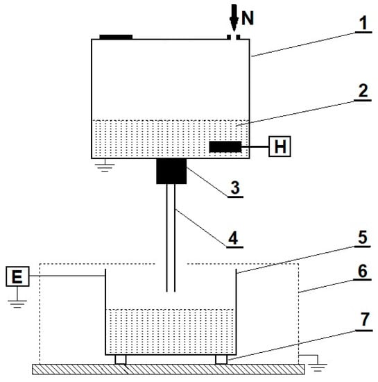 Flow-through system for the investigation of streaming electrification of insulation liquids: 1—upper container, 2—liquid, 3—solenoid valve, 4—measuring pipe, 5—lower container, 6—Faraday cage, 7—Teflon insulator, H—heater with a thermostat, and E—Keithley 6517A electrometer.