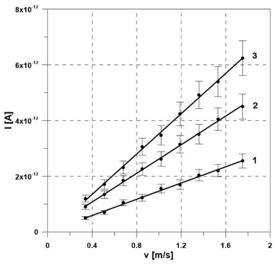 Electrification current vs. flow velocity of oil 1 (1—cellulose pipe, 2—aramid pipe, 3—aluminum pipe, T = 20 °C).