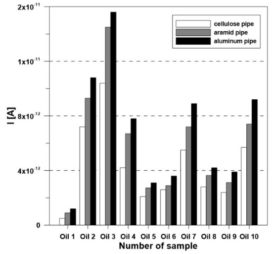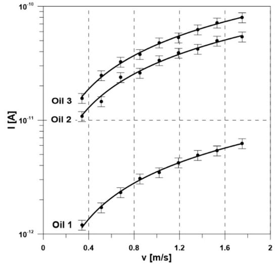 Figure 2 shows the characteristics of the streaming electrification current generated due to the flow of the Nytro Taurus fresh mineral oil (oil 1) through the pipes made from various materials. The streaming electrification current was linearly dependent on the flow rate of the insulation liquid. It was found that the intensity of the streaming electrification phenomenon significantly depended on the material the measuring pipe was made from. The mineral oil tested was least electrified for the flow through a cellulose pipe. The highest values of the electrification current were measured when using a metal pipe (aluminum). When changing the flow speed from 0.34 to 1.75 m/s, the electrification current increased from 0.5 to 2.55 pA (cellulose pipe), from 0.9 to 4.5 pA (aramid pipe), and from 1.2 to 6.3 pA (aluminum pipe). In Figure 3, the plots of the electrification current of oils 1–3 using an aluminum pipe are compared. A logarithmic scale was used for a better comparison of the current characteristics.
