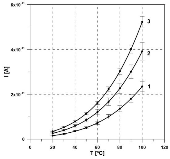 For a sample flow speed of v = 1 m/s and temperature of T = 100 °C, the electrification current of the fresh mineral oil increased: 23 pA in a cellulose pipe, 39 pA in an aramid pipe, and 52 pA in an aluminum pipe. A comparison of current characteristics in the temperature function of oils 1–3 is shown using a logarithmic scale (Figure 6).