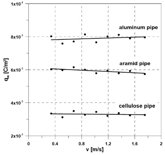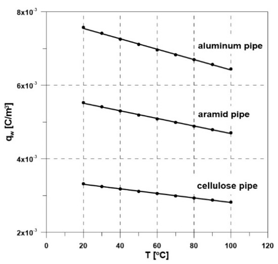 To fully visualize the differences in the measured electrification current values vs. temperature of all oil samples, a collective bar graph was made (Figure 7). Of all the tested samples collected from transformers, oil 3 displayed the highest values of electrification currents in the whole range of flow speed and temperature. At 20 °C and at the maximum flow speed (1.75 m/s), the electrification current of oil 3 was 80 pA, and it achieved a value of 548 pA at 100 °C. Based on the measurements of the electrification currents and selected physicochemical properties of mineral oil samples (Table 1), the volume charge density qw at the solid and liquid phase contact border was determined using the mathematical Abedian–Sonin model. According to the model’s assumptions, this parameter constitutes a material index that describes the ECT of insulation liquid since it is dependent on the properties of the liquid and the surface of a solid body, and it does not depend on hydrodynamic conditions (liquid flow speed). The characteristics qw = f(v) for oil 1 shown in Figure 8 successfully verified the adopted model’s assumptions. The average values of charge qw for fresh mineral oil flowing through the cellulose, aramid, and aluminum pipes at 20 °C were 0.0033 C/m3, 0.0059 C/m3, and 0.0079 C/m3, respectively.