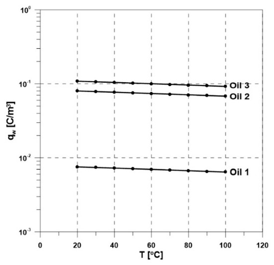 The change of qw resulted from the influence of temperature on other physicochemical parameters included in the Abedian–Sonin model. Temperature has a significant impact on most measured physicochemical values of insulation liquids, including conductivity and relative permittivity, as well as the parameters connected with hydrodynamics, such as kinetic viscosity or oil density. This fact shows that temperature does not directly cause the danger of static electrification in a transformer insulation system. However, its significance cannot be ignored as it has a significant impact on the aging processes taking place in a transformer insulation system.