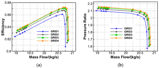 To study the influence of the number of grid nodes in numerical simulation on the flow field structure of the supersonic rotor, the grid independence check of Rotor37 is carried out in this Section. Figure 1 shows the isentropic efficiency and total pressure ratio characteristics of Rotor37 in different grid nodes. The number of grids of GRID1, GRID2, GRID3, and GRID4 was about 0.6 million, 0.8 million, 1 million, and 1.2 million, respectively. The four grids had the same topology structure. It can be seen that with the increase in the number of grid nodes, the peak efficiency and mass flow increased gradually, but when the number of grid nodes was more than 1 million, the increase in the number of grid nodes had little effect on the flow field. An excessive number of grid nodes will significantly increase the computing resources required, which is not conducive to the development and effective conduct of the research. Therefore, the final computing grid of Rotor37 was about 1 million.