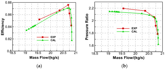 The comparison of the numerical simulation and the experimental results of Rotor37. (a) The isentropic efficiency; (b) the total pressure ratio.