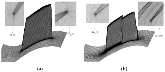 The flow solver EURANUS in NUMECA was used for the present work. The flow solver of EURANUS solves the compressible 3D RANS equations on a structured multi-block grid. The RANS equations were discretized in space using a cell-centered finite volume scheme with fourth-order artificial dissipation. And the equations were solved using an explicit fourth-order Runge–Kutta method with a local time step. The accuracy of the cell-centered finite volume scheme, which contains information on the left and right sides of a spatial point, is the second order. The accuracy of the 4-stage fourth-order Runge–Kutta method is the fourth-order, which contains four time-step information. The total pressure, total temperature, and flow direction in the absolute frame of reference were applied at the inlet [25]. A static pressure at the mid-span was specified at the outlet, and the static pressure from hub to shroud was obtained by the radial equilibrium equation. No-slip, no-heat transfer boundary conditions were imposed on the solid walls. The one-equation turbulence model of Spalart-Allmaras (SA) [26] was utilized for the turbulence calculation, which has shown good results and has been widely used in the researches of tandem configurations [27,28]. The NUMECA/autogrid5 was used to mesh the passage of the cascade, and a single channel O4H topology was generated. The butterfly grid technique was used in the real blade tip clearance. The grid orthogonality was more than 10°. To meet the requirement of the SA turbulence model that the boundary layer Y+ was less than 10, the mesh scale of the near-wall surface was 1e-6m.