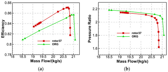 The characteristic comparison of Rotor37 and the original tandem rotor. (a) The isentropic efficiency; (b) the total pressure ratio.