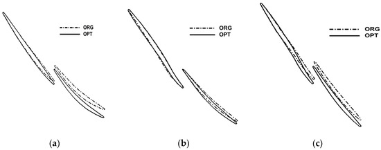 The cascade profile comparison of the original and optimized tandem rotor. (a) The hub section; (b) the middle section; (c) the tip section.