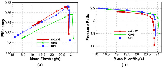 The characteristics comparison of Rotor37 and the original and optimized tandem rotor. (a) The isentropic efficiency; (b) the total pressure ratio.