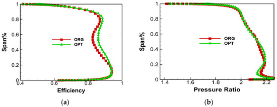 The span performance of the original and optimized tandem rotor. (a) The efficiency; (b) the total pressure ratio.