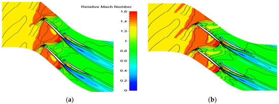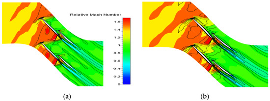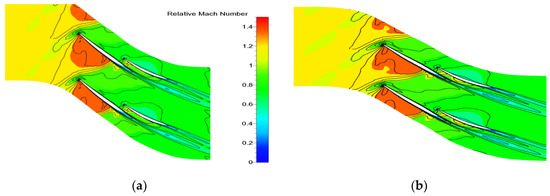The relative Mach number of 10% span of the original and optimized tandem rotor. (a) Original tandem rotor (ORG); (b) optimal tandem rotor (OPT).