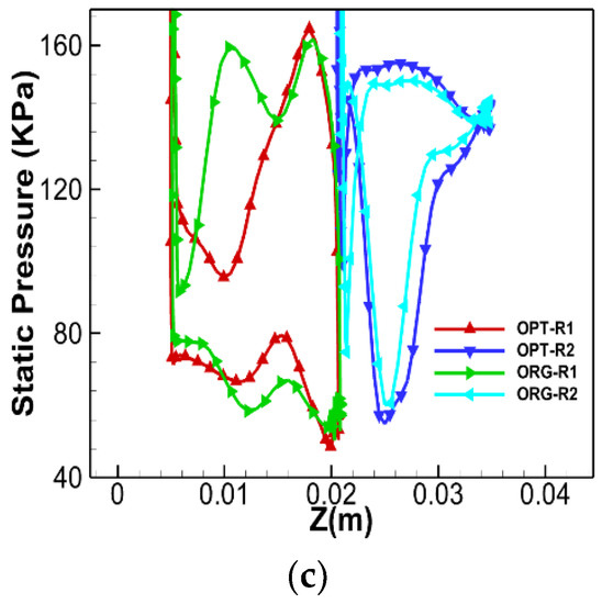 The static pressure distribution on the surface of the original and optimized tandem rotor. (a) 10% span; (b) 50% span; (c) 90% span.