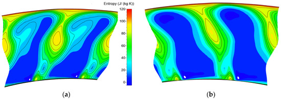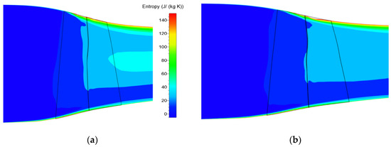 The entropy distribution of the mean flow surface of the original and optimized tandem rotor. (a) ORG; (b) OPT.