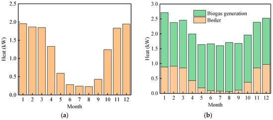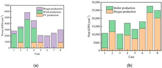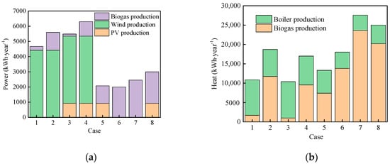 - The wind (1 kW capacity)-biogas-genset-battery system is the most optimal choice with appropriate NPC ($14,507) and the lowest COE ($0.588 kW−1·h−1). The system can also provide the heat of 2227 kWh from the biogas genset, which can save 19.9% of the total heat supply by the boiler.