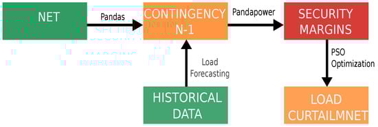 To optimize load curtailment, this paper proposes the use of PSO algorithm. PSO optimizes the load curtailment by allocating the amount of power to disconnect per load if required. PSO was selected as the method to optimize load shedding because of its simple implementation, fast convergence, and adaptability to the problem. To summarize, Figure 2 shows the proposed algorithm for load curtailment optimization considering the operating security margins, where is the hour to assess and is the vector with the load factor to cut off.