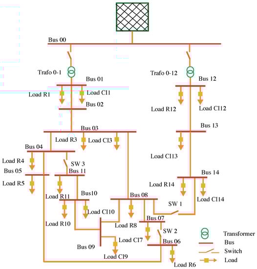 Figure 3 shows the assumed distribution network []. This system includes two power transformers, 18 loads, and 15 lines. In order to perform the simulation, power profiles with time stamps of 1 during one week were assumed for each load. The load profiles were fitted to Fourier series using historical records []. Pandapower tool [] was used to run load flows with the Newton–Raphson algorithm. The load flow was executed for each hour during an entire week in order to identify violations of the security margins in three assumed scenarios: The first one consists in the operation in normal conditions; the second one, under contingency without optimization of load curtailment; and the third one, operation under contingency with an optimal load curtailment.