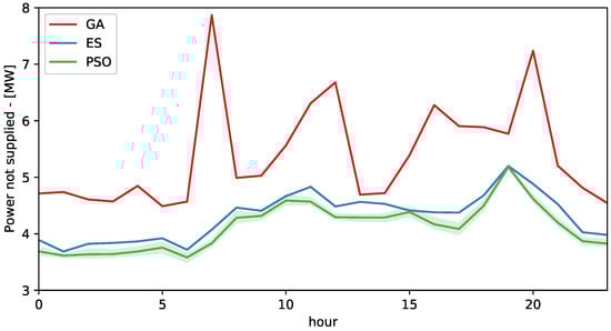 The PSO algorithm was utilized to optimize the load curtailment thanks to the inspyred library []. A population size of 40, a neighborhood size of 10, and 2000 max evaluations were used as fitting parameters. The assumed security margins were both the loading of transformers and lines below 100%, and bus voltages limits from 0.9 to 1.1 . The algorithm was run times. The entire simulation elapsed in a laptop with 8 GB RAM and a Dual-Core Intel Core i5 processor. In order to evaluate the algorithm convergence, 10 runs were performed for Thursdays, which are considered the most critical days. Similarly, the response of the PSO method was compared with GA and Evolution Strategy (ES) optimization techniques using the inspyred library. The population size and max evaluations were 40 and 2000, respectively. Figure 4 shows the results of the 10 trials and the comparison with GA and ES to solve Equation (2). It can be noticed that the PSO converges to the optimum in the 10 trials with a maximum difference of . Furthermore, the PSO algorithm here employed demonstrated performance advantages when compared to other meta-heuristic methods: better optimal points and better stability under multiple runs.