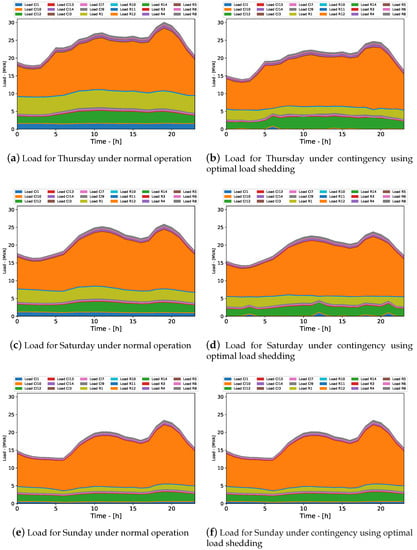 The simulation was performed assuming a contingency resulting from a failure of the transformer TR 0-1. The model evaluation is realized through a comparison of the system operating according to the three different scenarios previously defined. Figure 5 shows the simulation results of the load behavior under the first and third scenarios. Figure 5b,d shown the load curtailment during Thursday and Saturday performing with the optimization algorithm. On Sunday, load cut-off was not necessary.