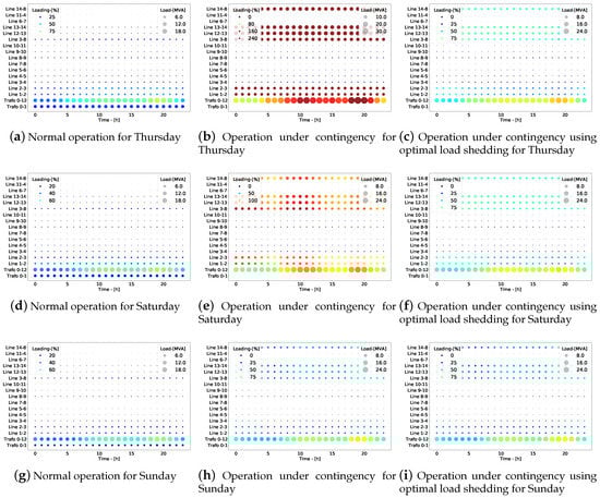 To illustrate the performance of the transformers and lines for the three scenarios, Figure 6 shows their loadings on different days. Here, it can be noted that, during normal operation, Figure 6a,d,g, the loading of the transformer 0-12 is close to 70% with a power flow close to 20 during the load peaks, opposite to transformer 0-1. The loading of Transformer 0-1 presents a constant value close to 30% with a power flow of 10 approximately. The lines show a low loading, lower than 50%. However, during the contingency, Trafo 0-12 and lines 1-2, 2-3, 3-8, 12-13, 13-14, and 14-8 suffer an overload on Thursdays, as shown in Figure 6b. In that case, switch SW1 is assumed to be closed. These overloads will reach 240%. These violations of the loading security margins are a consequence of TR 0-1 failure, since, during the contingency, through these lines and the Trafo 0-12 flows the power to supply the loads R1 and CI1, approximately 7 . Under such operating conditions, these loads are located at the end of the circuit. Additionally, Trafo 0-12 shows the maximum overloads from 9:00 a.m. to 11:00 a.m. and from 5:00 p.m. to 8:00 p.m. This coincides with Figure 5a, which shows that the maximum loads peak occurs during these periods. A similar behavior occurs on Saturdays. However, on those days, the overloading of the asset is lower in time and magnitude, as shown Figure 6e. By contrast, on Sundays, there is no overloading of the transformers and lines, as shown in Figure 6h. Finally, Figure 6c,f,i show the loading using the load curtailment optimization algorithm to ensure the compliance of security margins during the contingency operation. Here, it can be appreciated that, by using the load shedding strategy, the lines and transformers present a higher loading than in normal operation (scenario one), but are maintained within security margins, as can be noted by comparing with scenario two.