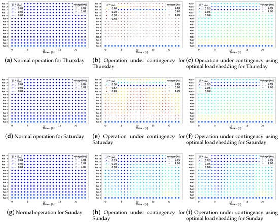 The second type of security margins is related to voltage limits. Figure 7 shows both the voltage magnitude and voltage deviation in nodes of the system for the three scenarios. As can be seen, there is a behavior similar to the one obtained in the violation of loading security margins. In scenario one, normal operation, the bus voltage deviation is lower than pu, as expected. This is shown in Figure 7d,g. In scenario two, the most critical days for voltage margin violations are Thursdays. On these days, the voltage drops to pu in almost all buses, as shown in Figure 7b. On Saturdays, the maximum voltage deviation is pu. However, as shown in Figure 7h, on Sundays, voltage security margin violations do not occur when Trafo 0-1 is out of service. In scenario three, the use of the proposed algorithm for load curtailment allows maintaining the operating voltage inside the security margins, as shown in Figure 7c,f,i, where a maximum deviation of pu is observed.