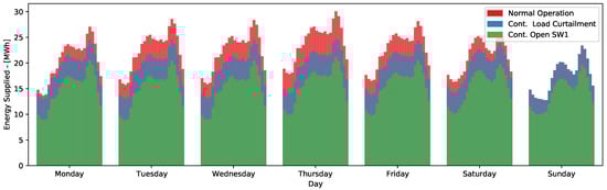 In order to assess the simulation results, both the expected energy not supplied (EENS) and the SAIDI are computed for contingencies, considering on the one hand the optimal load curtailment algorithm, and on the other hand the opening of the SW1. These changes in the switch status are assumed to be the conventional method used by system operators to avoid operating the network out of security margins. To compute the , the power cut off was assumed to be equivalent to the affected users, and the total number of users was assumed equal to the total power supplied. The EENS was computed as the expected power to supply minus the power supplied during the contingency for both cases. Figure 8 shows the total power supplied hourly for the three assumed scenarios during the week. It is worth noting the impact of performing the algorithm for load curtailment. In all cases, the energy supplied using the proposed algorithm was greater than in the scenario where the conventional method is used (opening SW1).