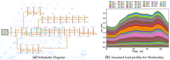 In order to assess the scalability of the proposed method, the IEEE 33 bus test system was used to evaluate the algorithm, similarly to the previous analysis. Figure 9 shows the topology of the system and the assumed load profiles for Wednesdays. Those days were contemplated as the most critical.