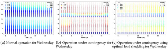 Bus voltages for different days and hours considering: the normal operation, a contingency when line 1-2 is out of service, and the results of load shedding using the proposed methodology for the same contingency.
